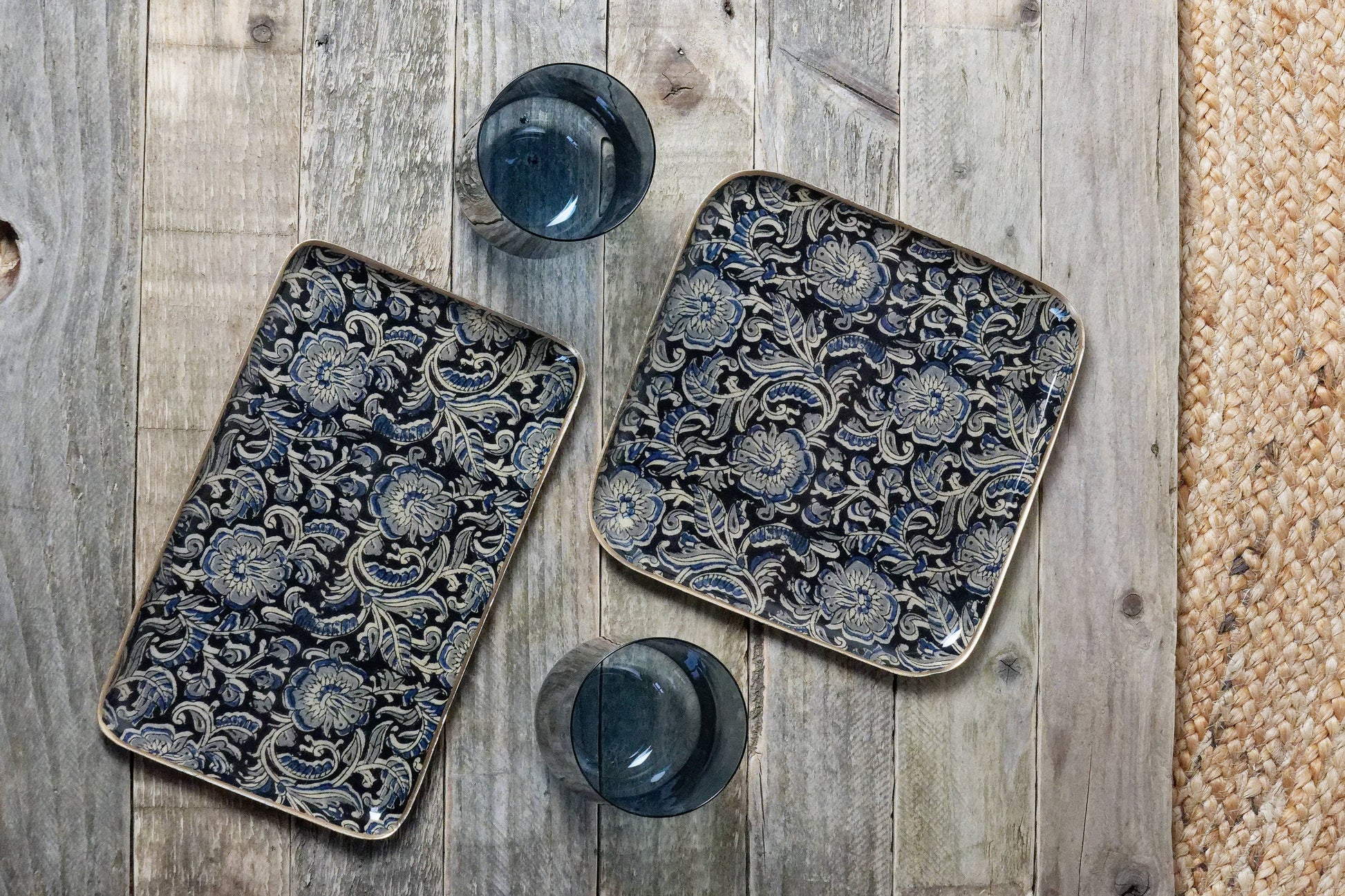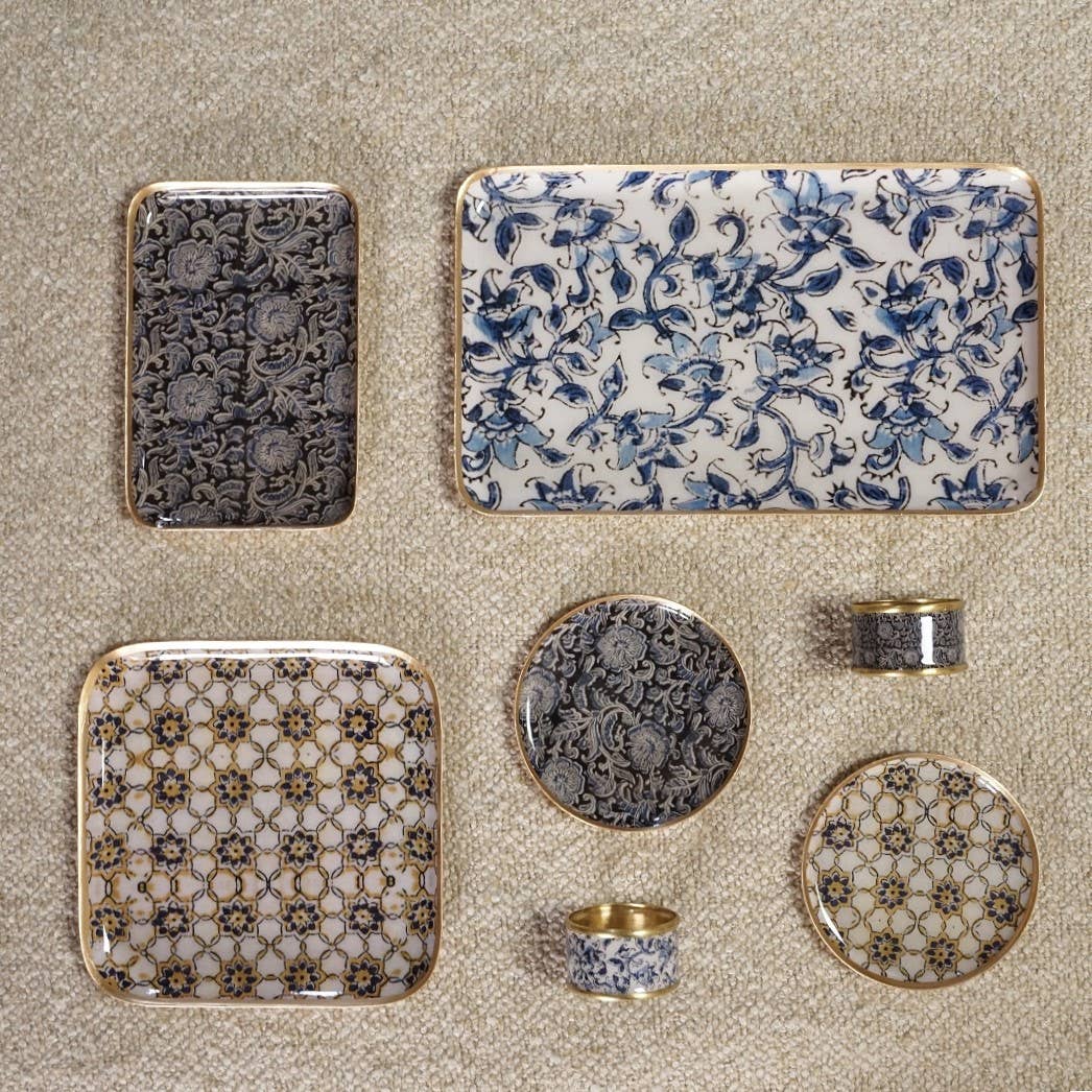 Plateau en métal émaillé, fabrication artisanale manuelle. Joli décor bleu et noir, inspiré des tissus traditionnels indiens. Verso doré, bordure dorée peinte à la à la main. C'est le plateau idéal pour servir un café ou un thé, servir de petit vide -poches dans l'entrée.