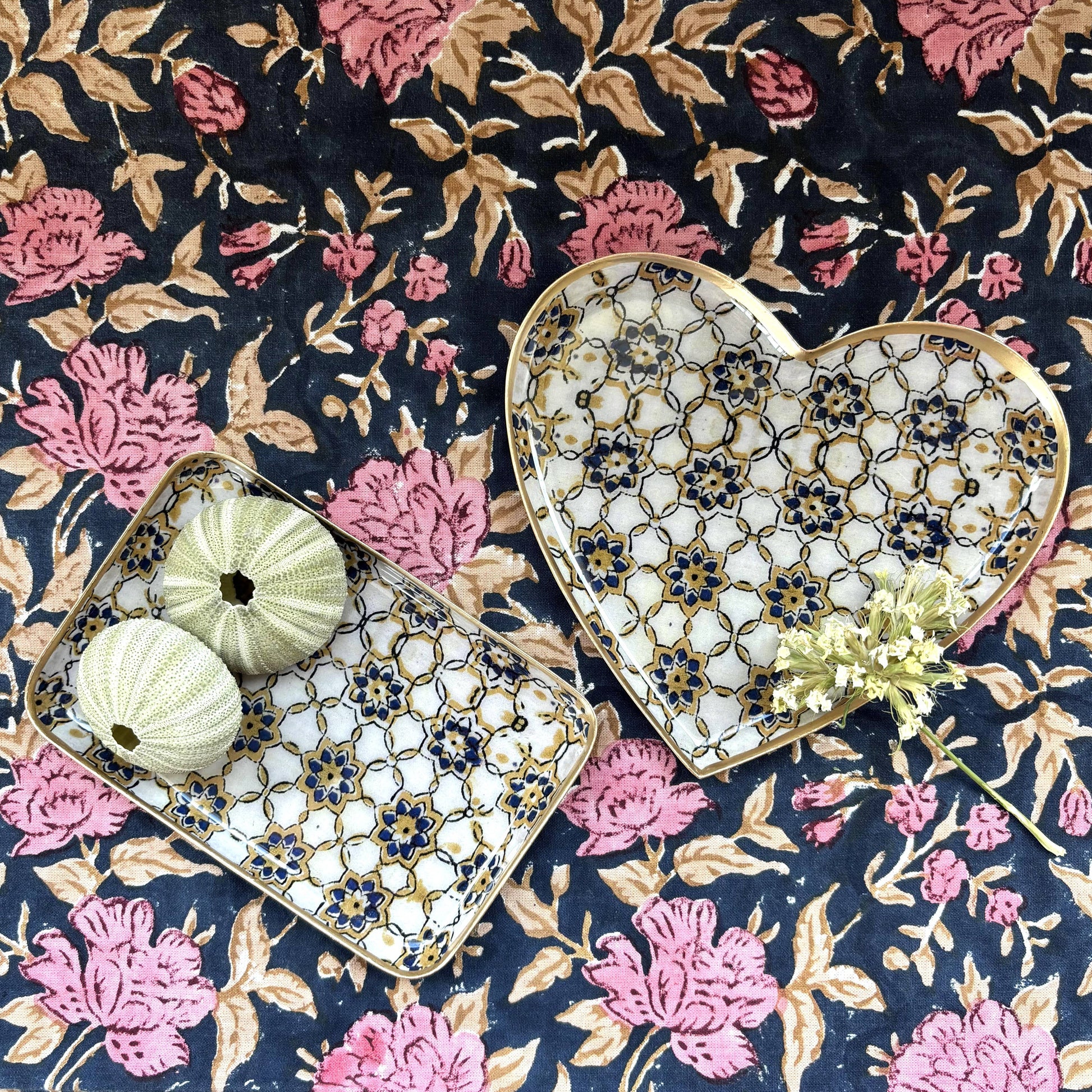 Plateau en métal émaillé, fabrication artisanale manuelle. Joli décor bleu et écru sur fond noir, inspiré des tissus traditionnels indiens. Verso doré, bordure dorée peinte à la à la main. C'est le plateau idéal pour servir un café ou un thé, servir de petit vide -poches dans l'entrée. Dimensions 10x15 cm